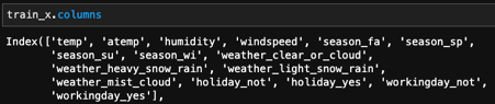 R-square 값이 0.210으로, 이 회귀식은 무의미한 회귀식이란 것을 알 수 있다. 변수별 P-value값을 보면 season_sp, season_su, weather변수 전부, workingday_not 들이 p-value값이 매우 높으므로 변수에서 탈락시켜도 무방할 것으로 보인다.