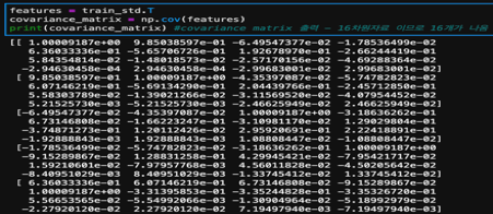Features 라는 변수에 전처리한 train_std의 트랜스폼한 결과를 저장한다. Numpy 라이브러리에서 제공해주는 cov method를 통해 covariance matrix를 출력한다. 16x16의 covariance matrix가 출력된다.
