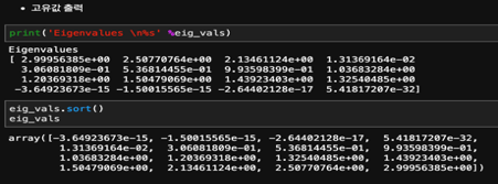 마찬가지로 numpy 라이브러리를 이용해 고유값과 고유벡터를 출력한다. 16개의 변수, 16차원의 데이터셋이므로 16개의 고유값과 고유벡터가 추출된다. 고유벡터중 1이상의 값을 가지는(즉, 1개 이상의 설명력을 가지는) 8개의 주성분을 얻을 수 있다.