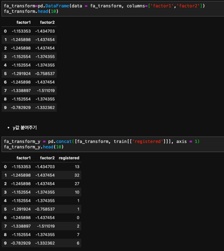 기존 데이터셋에 요인분석 결과를 내적하여 새로운 데이터셋을 만들어 준다. 이 데이터셋에 y값을 다시 합성해주고 이후 회귀분석을 실시한다..