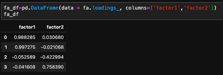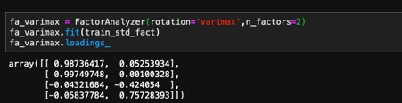 FactorAnalyzer 라이브러리를 통해 요인분석을 실행한다. 처음엔 회전없이 요인분석을 진행했고, 두번째로는 직교회전인 varimax회전을 통해 진행했다. 진행한 결과 4개의 독립변수에 대해 2개의 요인이 추출된 것을 알 수 있다.
