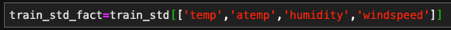 요인1에는 온도와 체감온도의 많은 요인적재가 이루어졌다. 이는 외부 온도 라는 요인으로 차원 축소를 할 수 있음을 나타낸다. 요인2에는 습도와 풍속이 반대 방향으로 많은 적재가 이루어졌다. 습도가 낮을 수록, 풍속이 높을 수록 많은 수요가 있음을 나타낸다.